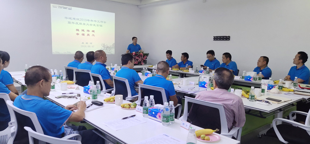 On September 7, 2019, Huayu Construction's 2019 Mid-year Work Conference and 2018 Annual Shareholders Meeting were held in Shenzhen.Yi Xinhe, Chairman of Huayu Group, Zhao Fuxin, Vice President of Huayu Group, Yao Lin, General Manager of Huayu Construction, Liao Chulong, Deputy General Manager of Huayu Construction, and Heads of various departments of Huayu Construction, project managers participated in the meeting.