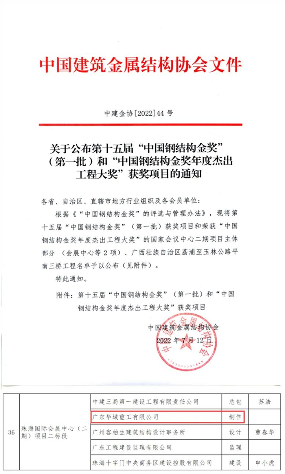 近日,中國建筑金屬結(jié)構(gòu)協(xié)會(huì)正式公布第十五屆“中國鋼結(jié)構(gòu)金獎(jiǎng)”(第一批)工程獲獎(jiǎng)項(xiàng)目名單,華域重工參與制作的珠海國際會(huì)展中心(二期)項(xiàng)目二標(biāo)段榮獲“中國鋼結(jié)構(gòu)金獎(jiǎng)”。