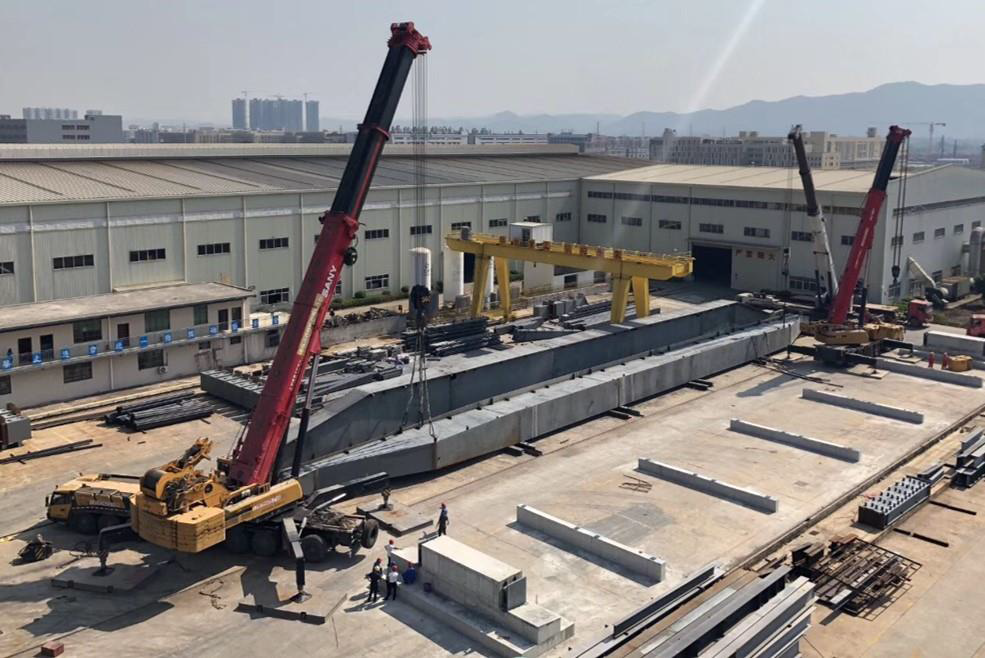 該72米大跨鋼箱梁?jiǎn)胃孛?span lang="EN-US">3.4*2.8米,重達(dá)220噸,焊接制作要求高、難度大,且需同時(shí)制作兩根。華域重工經(jīng)過整體預(yù)拼裝、整體焊接、外觀處理及焊縫驗(yàn)收等一系列工序后,為確保施工現(xiàn)場(chǎng)順利安全提升,還在工廠進(jìn)行了加載實(shí)驗(yàn)。實(shí)驗(yàn)包括加載1000噸外力的鋼梁撓度測(cè)量,焊縫及板材內(nèi)部組織變化情況測(cè)定等,僅一次實(shí)驗(yàn)便達(dá)到了設(shè)計(jì)要求的所有標(biāo)準(zhǔn)。